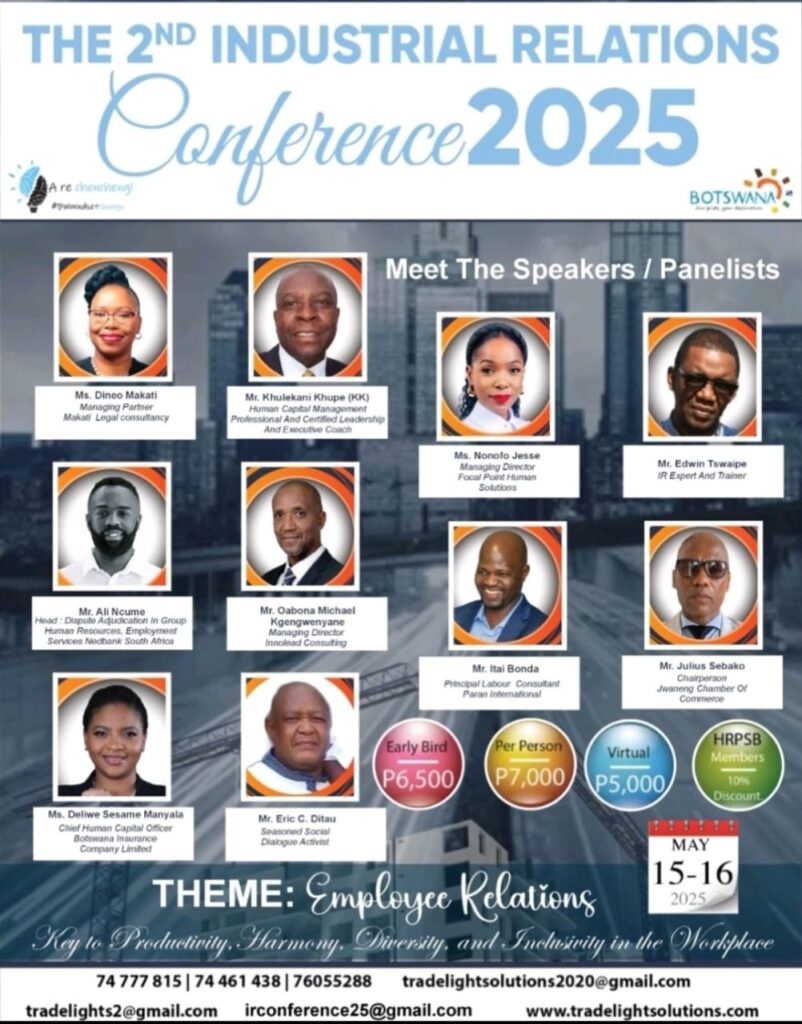 Tradelights Solutions 100% citizen owned Human Resource Consultancy would like to invite you to participate in the 2nd Industrial Relations Conference to be held in Gaborone, Botswana on the 15th and 16th May 2024. The theme is: Employee Relations: Key to Productivity, Harmony, Diversity and Inclusivity in the Workplace.